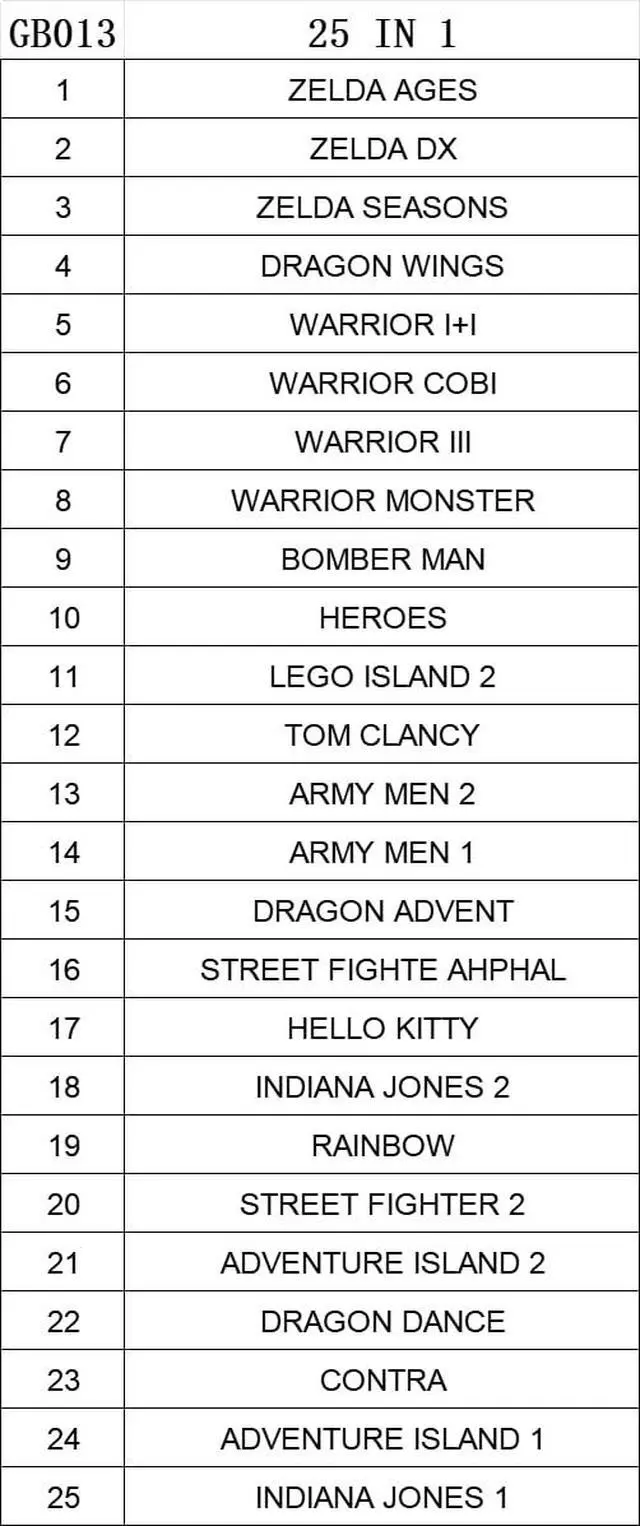 New and high quality.Compatible for both US/EU/JAP versions console.RPG games can be saved by the battery inside,but Action games have no saving function.25 in 1.GBC games can't play on the GB game console.