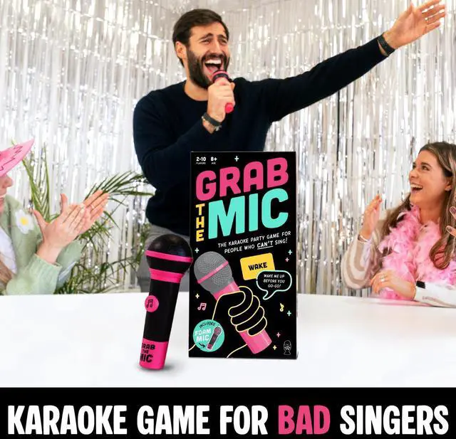 Official Grab The Mic Family Karaoke Board Game w/Foam Mic, 8+ Ages, 2-10 Players - Games for Bad Singers w/ 240 Lyrics (120 Cards) (First Edition)