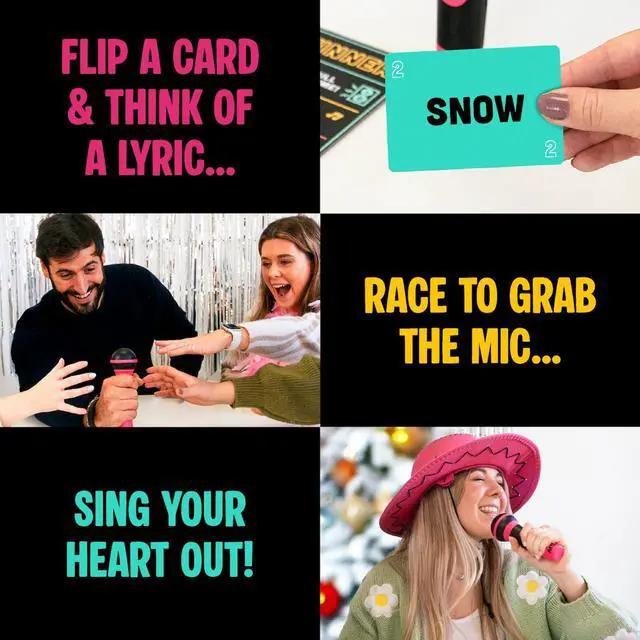 FAST-PACED FUN - Flip a card, think quickly, and race to grab the foam microphone to sing a lyric containing the revealed word. It's a fast-paced game that keeps everyone on their toes!
