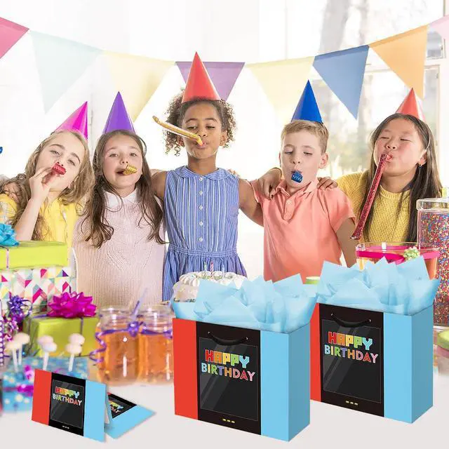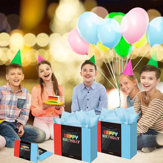 The video game bags showcase a bold 'HAPPY BIRTHDAY' design with colorful lettering against a sleek black center panel.