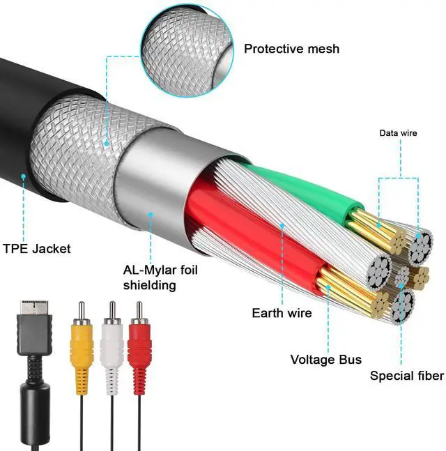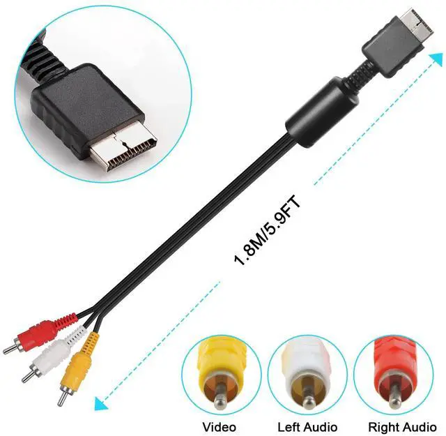 Multimedia cable for Playstation that provides composite RCA video & audio output simultaneously for connecting your game console to TV directly, Red for right channel, White for left channel and Yellow for video.