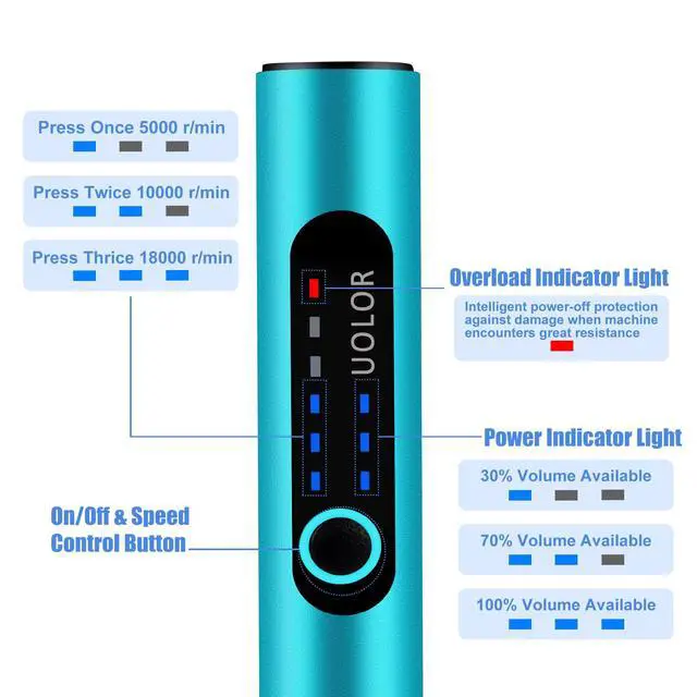 Uolor rechargeable electric drill has 3 levels speeds. Press once, 5000r/min. Press twice,10000r/min. Press thrice, 18000r/min.