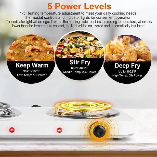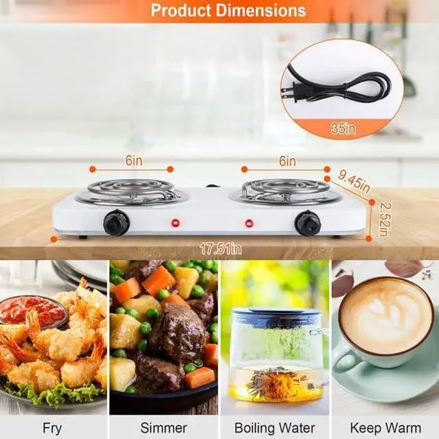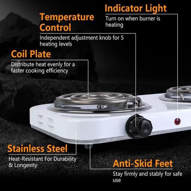 The 2-burner electric cooktop comes with a variable temperature control knob so you can cook or keep food warm at just the right temperature. The single burner coil distributes heat evenly, while the convenient power indicator light provides added peace of mind and ease during use.