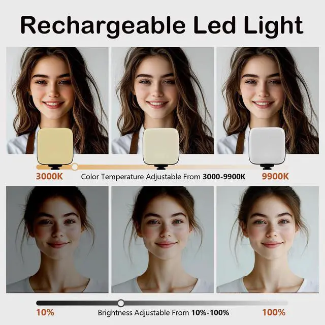 Adjustable Brightness Soft LightColor temperature ranges from 3000K to 9900K, with brightness adjustable between 10% and 100% for effortless customization. Featuring a professional soft light panel for gentle illumination, it creates a flattering complexion in low-light environments. Equipped with a built-in high-capacity rechargeable battery and dual front/back clips, it's compatible with all smartphones, computers, cameras, and more.