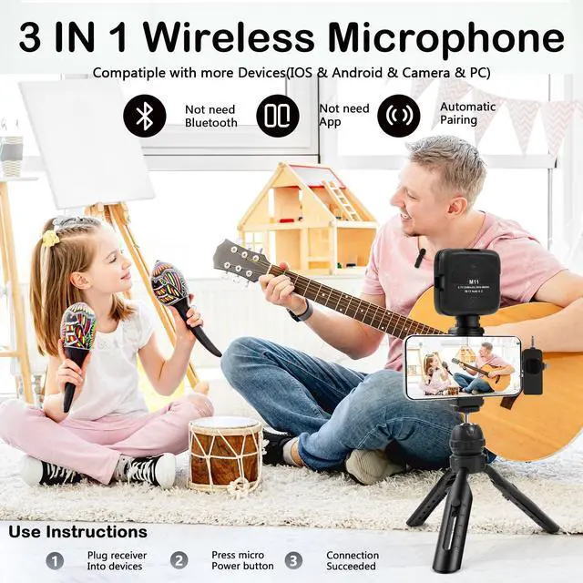 3 in 1 Professional Wireless Lavalier MicrophoneWireless Lavalier Microphone comes with a 3 in 1 universal receiver, Mini Microphone compatible with android smartphones, iphone, camera etc.Plug and play, no adapters, Bluetooth or apps required, just plug the receiver into your device.press and hold the power button on both the microphone and the receiver and the two parts will connect automatically.You can wear it on a lapel clip or hold it in your hand.