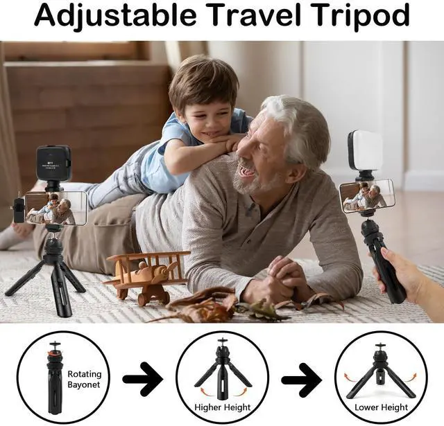 Adjustable Angle Tripod and Phone HolderThis iPhone vlogging kit tripod features a 360° rotating ball head, allowing flexible use as both a handheld selfie stick and desktop tripod. The phone holder accommodates smartphones with widths ranging from 2.36 inches to 3.94 inches.