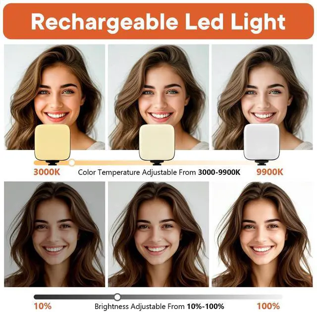 Rechargeable LED Soft LightColor temperature ranges from 3000K to 9900K, with brightness adjustable between 10% and 100%. Features a professional diffuser panel for uniform and bright light transmission, resulting in softer and more natural lighting effects. Built-in rechargeable battery with easy charging via USB port. Dual phone light clamp design compatible with various smartphones and laptops.