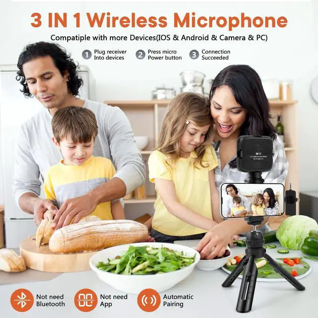 3 in 1 Professional Wireless Lavalier MicrophoneWireless Lavalier Microphone comes with a 3 in 1 universal receiver, Mini Microphone compatible with android smartphones, iphone, camera etc.Plug and play, no adapters, Bluetooth or apps required, just plug the receiver into your device.press and hold the power button on both the microphone and the receiver and the two parts will connect automatically.