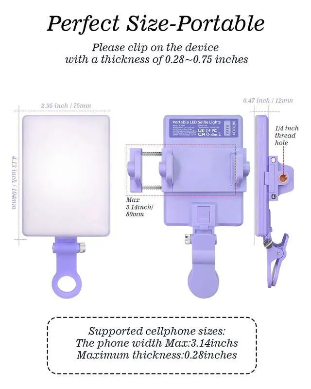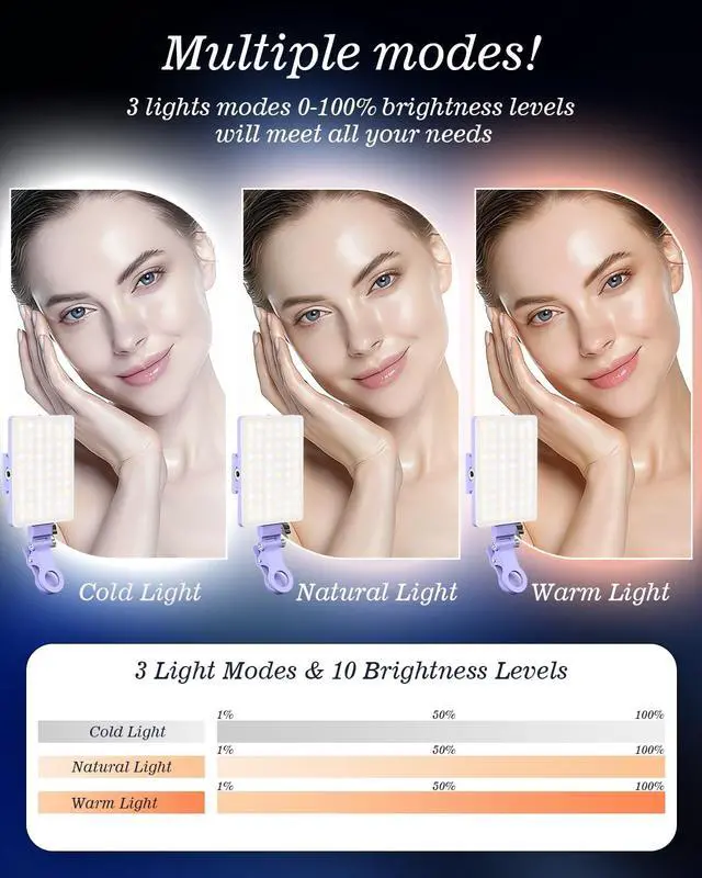 3 Light Modes & 10 Brightness LevelsThe selfie light has 3 Light Modes (White, Natural, Warm) from 2500K-6500K color temperature adjustable to meet all your needs, allowing you to be charming in any surroundings. Built-in 60 LED lighting beads with 10 levels brightness adjustable, compatible with phones, tablets, laptops, computers, tripods, and cameras. Works on TikTok, Facebook, YouTube, Twitter, Snapchat, FaceTime no matter indoor or outdoor, daytime or at night.