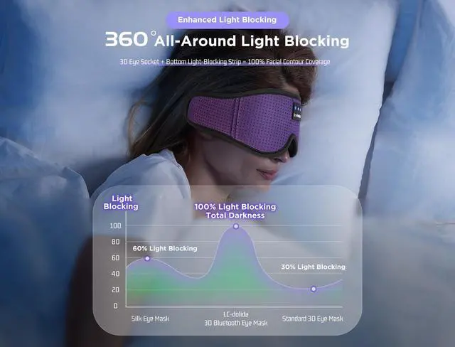 Upgraded 3D Contour Design & No Eye PressureOur sleep mask with bluetooth headphones based on ergonomics.Our eyes can move freely with the 3D contoured bluetooth sleep mask. With no pressure on eyes, the bluetooth eye mask can bring you a comfortable and long-lasting sleep.The bluetooth sleep eye mask is the perfect Sleeping Headphones for side sleepers, choose LC-dolida sleeping bluetooth headphones, fall asleep fast, stay asleep and have a sweet dream