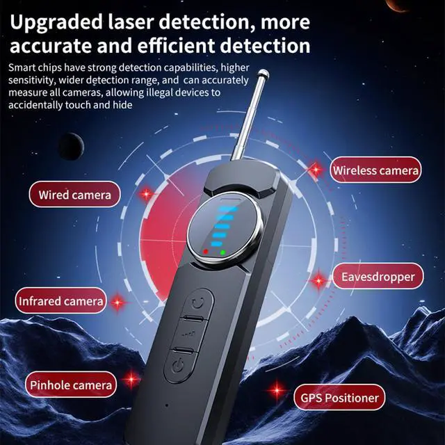 Professional All-in-One DetectorsBuilt-in intelligent AI chip, high-frequency scanning up to 5000 times per second. Built-in retractable antenna expands the detection range to 360 sqft. This detector integrates camera scanning, RF signal detection, GPS detection, eavesdropping device detection, and anti-theft alarm functions, making it a smarter privacy protection tool and anti-surveillance decision-making tool when you're away.