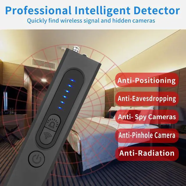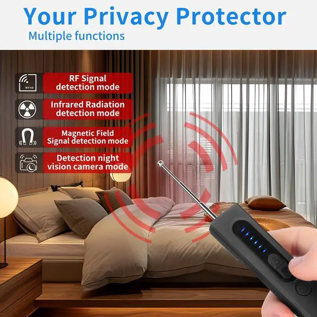 Multi-Functional Device with 4 Practical Modes 1.RF Detection: Identifies active RF bug transmitters, including transmitting cameras, GPS trackers, and wireless audio bugs. 2.Hidden Camera Detection: Locates hidden pinhole cameras through visual inspection with infrared laser scanning. 3.Magnetic Field Detection: Detects magnetic fields emitted by GPS trackers to find hidden bugs and related devices. 4.Built-In Flashlight: Provides illumination for convenient use even in dark environments.