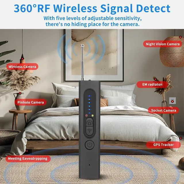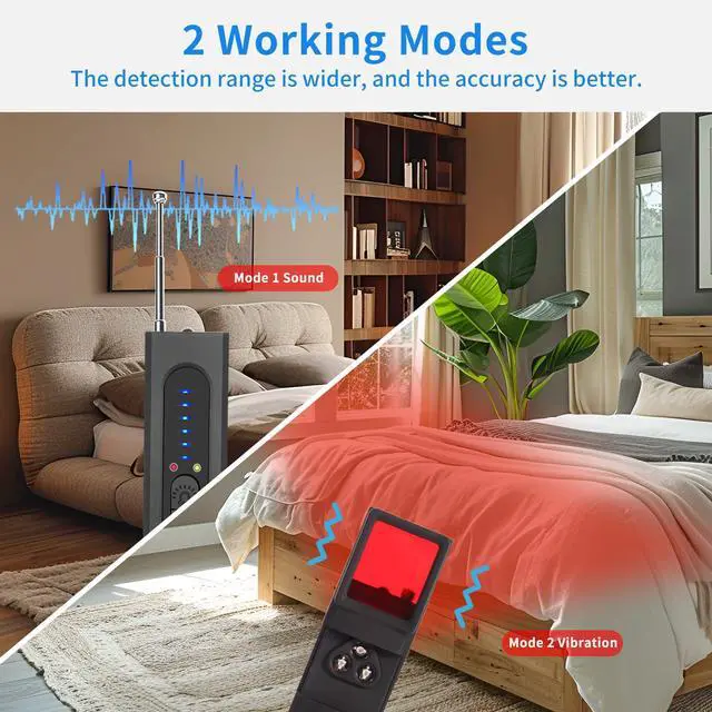 Powerful Detection Capability Equipped with 5 adjustable sensitivity levels, this detector identifies RF signals across a frequency range of 1MHz to 6.5GHz at a detection distance of 5cm to 8m. It works with common signal frequencies including 1.2G, 2.4G, and 5.8G to locate wireless cameras, GPS trackers, stealth miniature cameras, wireless audio bugs, wiretapping devices, phone taps, and GSM/CDMA/DECT cellular audio and video bugging devices. Two alert modes are available: audible beep and vibration.