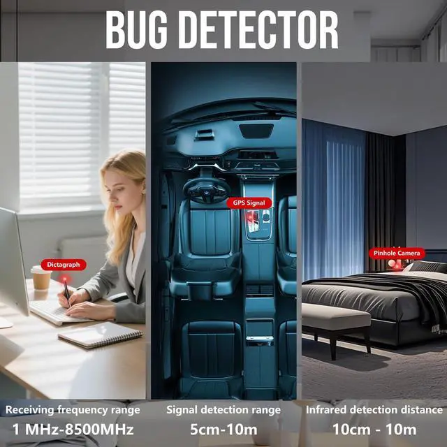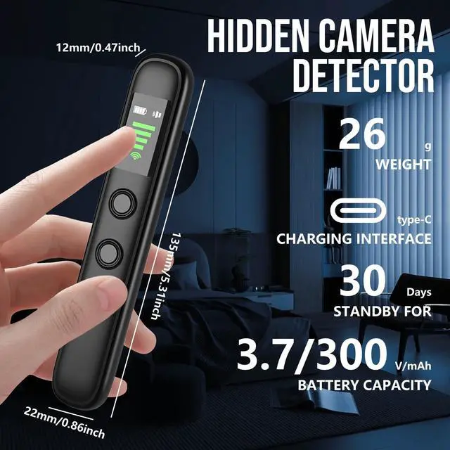 Detection Technology: Advanced sensor systems support the detection of infrared, wireless signals, and vibrations. Designed to identify hidden cameras and monitoring devices in indoor environments.