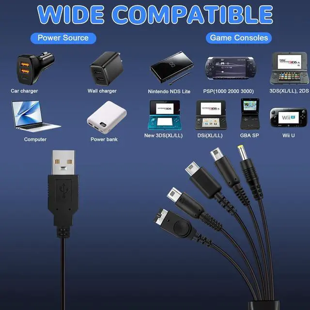Multi-Device Charging SolutionThis 5-in-1 universal USB charging cable supports 3DS XL, 2DS, DSi XL, DS Lite, GBoys Advance SP, PS-P, and Wii U Gamepad. Simplify your setup with one compact cable for retro and modern handheld consoles