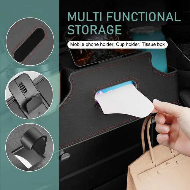 2.The tissue box is designed for easy access, and the cup holder prevents spills while also serving as a phone stand for navigation.
