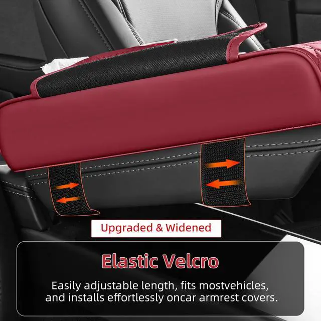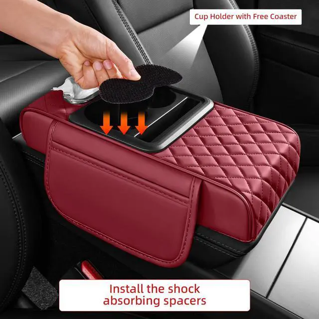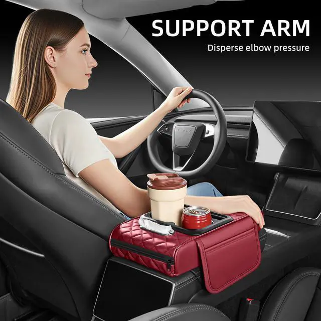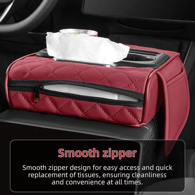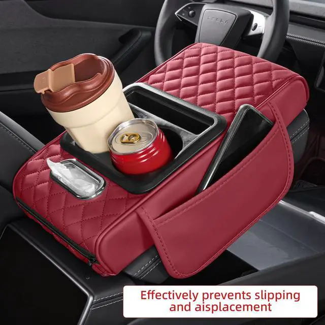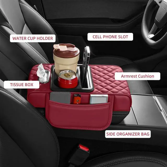 5 in 1 Car Center Console Cover, Armrest Pad with 2 Storage Pockets, Cup Holder, Tissue Box Slot, Phone Holder, Universal Car Interior Organizer (Burgundy)