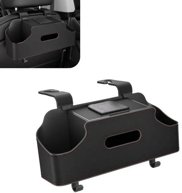 Car seat back storage rack is a multi-functional accessory. It has two cup holders, tissue boxes and hooks for holding water cups, small items, tissues, bags, umbrellas and more