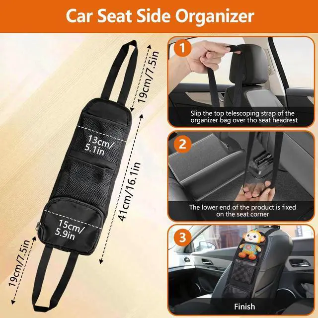 Yes, the car seat storage hanging bag uses a dual-attachment system - a headrest hook at the top and an elastic strap that attaches to the bottom of the seat.