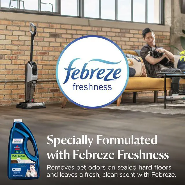 BISSELL PET Multi-Surface formula with lemon-eucalyptus cleans and refreshes sealed hard floors and area rugs with the help of essential oils.
