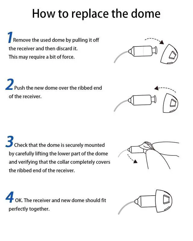 Replace hearing aid domes every 2-3 months or when it becomes stiff or brittle. After this period has expired, silicone products do not cover the auditory canal so tightly, which negatively affects sound amplification.