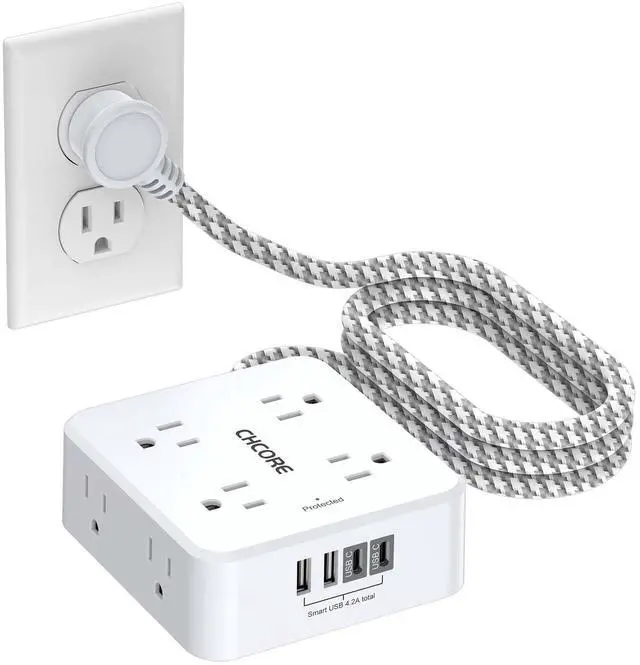 Surge Protector Power Strip - CHCORE 5Ft Braided Extension Cord with 8 Outlets with 4 USB (2 USB C) Charging Ports, Flat Plug Multi Plug Outlet Extender Charging Station for Home Office, ETL, White