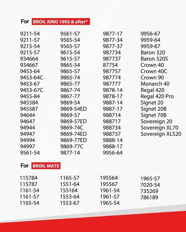 | Fits to BROILKING 1992+: | 9877-14, 9877-17, 9877-34, 9877-37, 987734, 987737, 987754, 987757, 987774, 987777, 9878-14, 9878-17, 9887-14, 9887-17, 988714, 988717, 988734 , 988737, 9888-14, 9888-17, 9956-64, 9956-67, 9959-64, 9959-67, Baron 320, Baron 320S, Crown 40, Crown 40C, Crown 90, Monarch 40, Regal 420, Regal 420 Pro, Signet 20, Signet 20B, Signet 70B, Sovereign 20, Sovereign XL70, Sovereign XLS20. |
