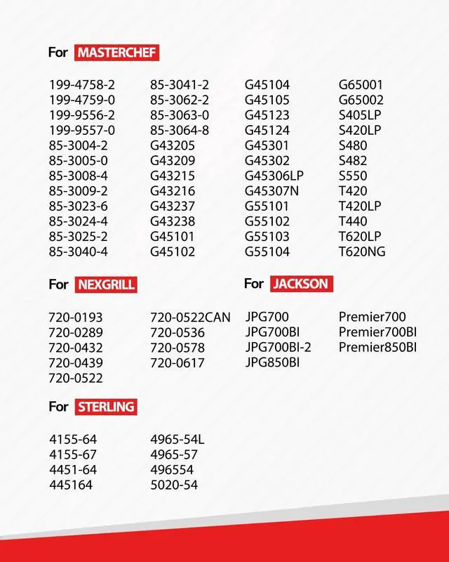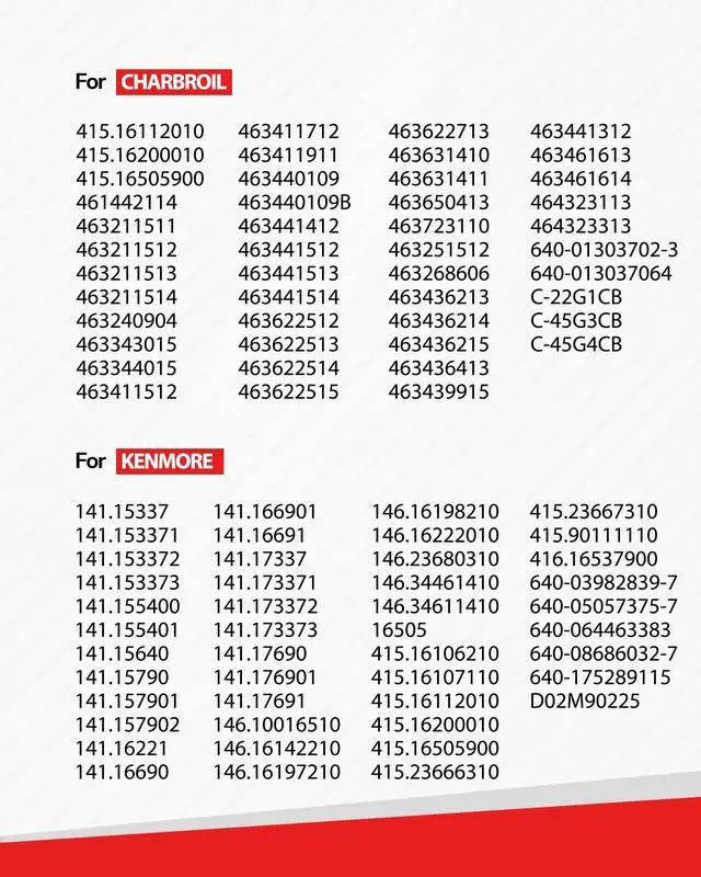 | Fits to Charbroil Models: | 415.16112010, 415.16200010, 415.16505900, 461442114, 463211511, 463211512, 463211513, 463211514, 463240904, 463343015 ,463344015, 463411512, 463411712, 463411911, 463440109, 463440109B, 463441412, 463441512, 463441513, 463441514, 463622512, 463622513, 463622514, 463622515, 463622713, 463631410, 463631411, 463650413, 463723110, 640-01303702-3, 640-013037064, C-22G1CB,C-45G3CB, C-45G4CB. |