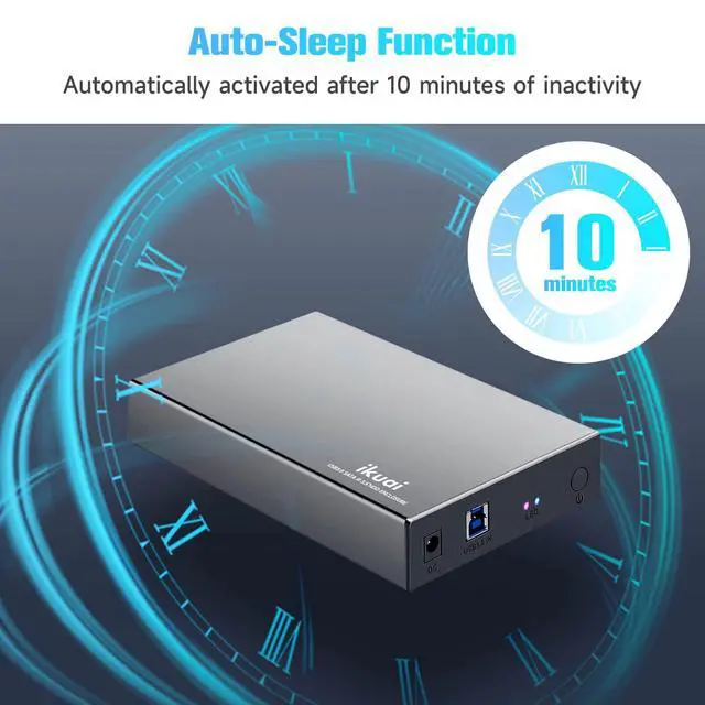 - SATA hard drive enclosure automatically activates sleep mode after 10min of inactivity.