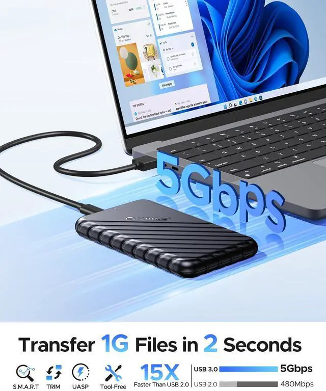 5Gbps with UASP AcceleratedThe maximum data transfer speed of the SSD enclosure is 5Gbps. The SATA interface of 2.5 hard drive enclosure supports UASP accelerated transmission protocol, 70% Faster than conventional USB 3.0 when connected to a computer that also supports UASP. Backward compatible with USB 2.0 or 1.1 ports