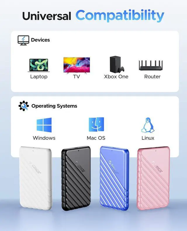 Wide CompatibilityThis SATA to USB 3.0 drive enclosure is suitable for 7mm,9.5mm 2.5 inch SATA III/ II/ I Hard Disk Drives or solid state drives. This ORICO 2.5 inch laoptop hard drive enclosure can be quickly recognized by Windows 2000/Windows 98/XP/Vista/ 7/8/10, Lunix, Mac OS 9.1/10.8.4 and above. Widely applied on PC, laptop, Xbox, PS5/PS4/PS3, Router, etc.