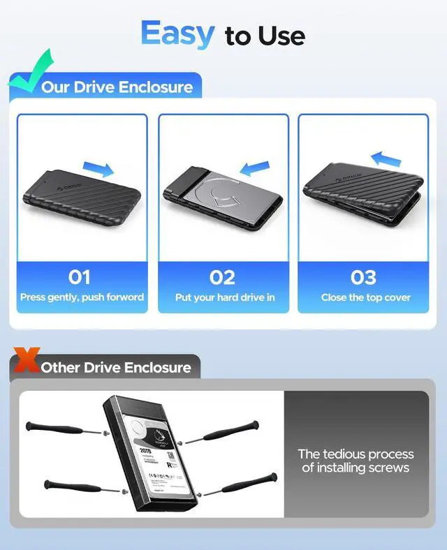 2.5" Hard Drive Enclosure ORICO hard drive enclosure can easily connects 2.5 inch SATA I/II/III SSD & HDD to PC, laptop, router, PS4, or Xbox for data transfer or expanding storage, recovering your old hard drives datas and make it rejuvenate