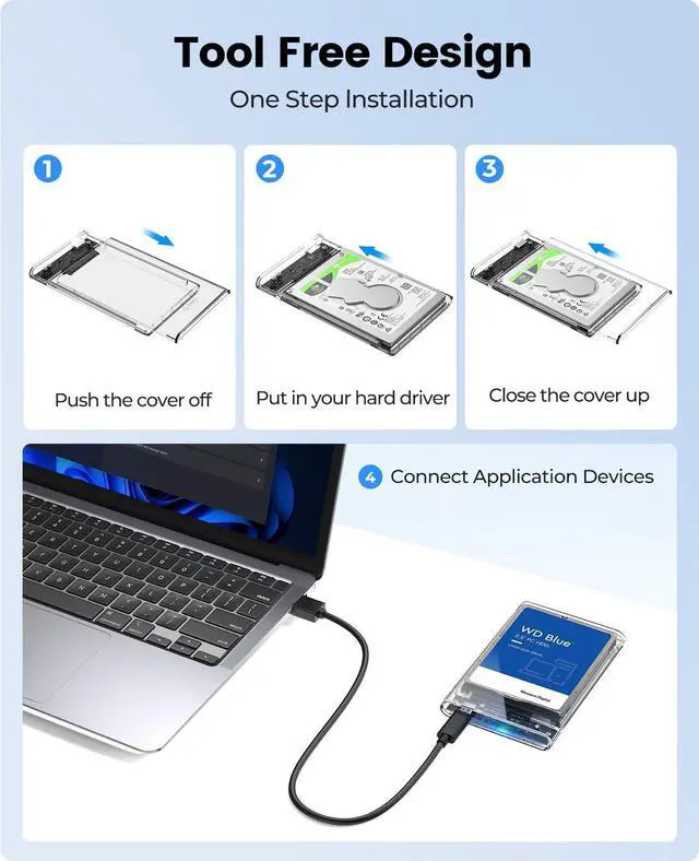 Tool Free Installation: No any tools and screws needed, you can easily slide the cover of the 2.5'' hdd enclosure and insert your hard drive in, just plug and play. The led indicator can inform you when your ssd enclosure is fuctioning at maximum capability, also compatible with Windows, Mac and Linux