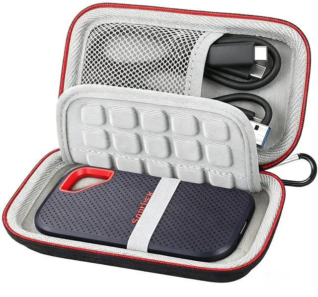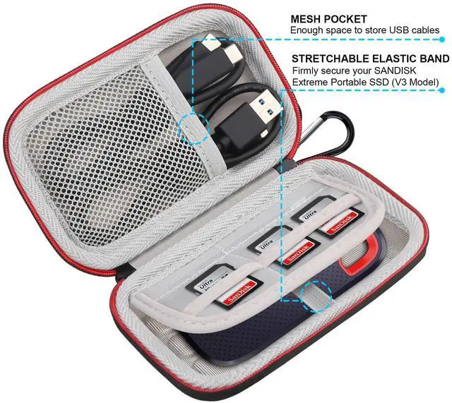 • SECURE COMPATIBILITY: Perfectly crafted for SANDISK Extreme Portable SSD (V3) 1TB 2TB 4TB. This SanDisk Extreme V3 SSD Case is your ultimate safeguard against SanDisk Extreme V3 SSD damage and loss. The dual-compartment design features a reinforced elastic band for snugly holding external ssd and the quality mesh pocket for usb cables or other small electronic accessories.