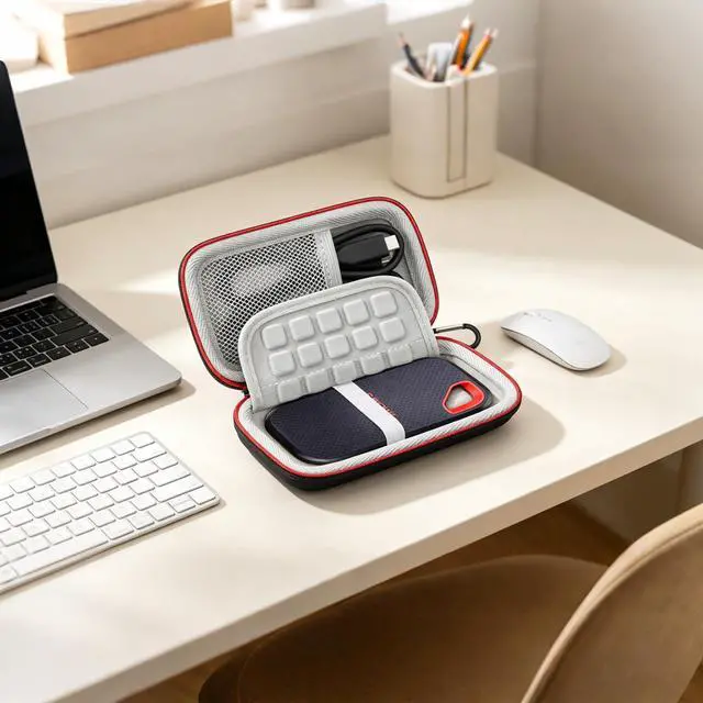 Mesh pocket built into the SANDISK ssd case to store your USB cable, charger and other practical accessories, also boasts extra plastic slots to place SD cards memory cards or other smaller but essential widgets. Every item stays now super clean, well-organized, and safe!