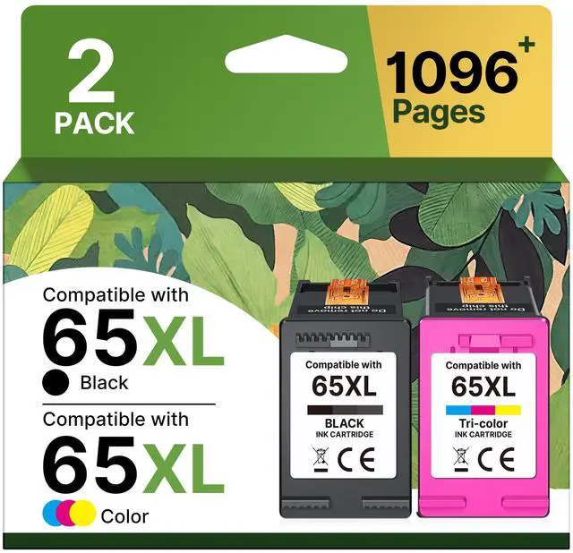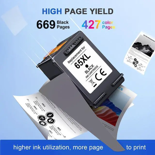| Higher Page Yield: | Up to 4X more prints for hp ink 65 XL. Page yield: 669 pages for hp ink 65 black, 427 pages for hp 65 ink tri-color. |