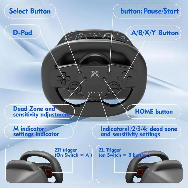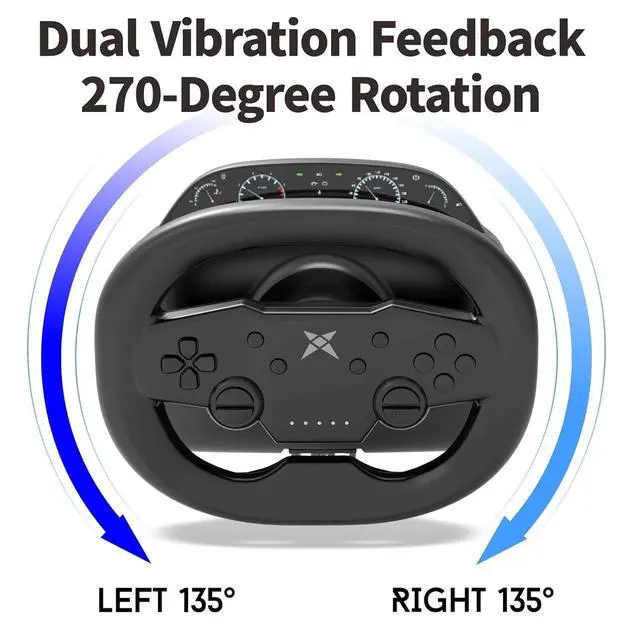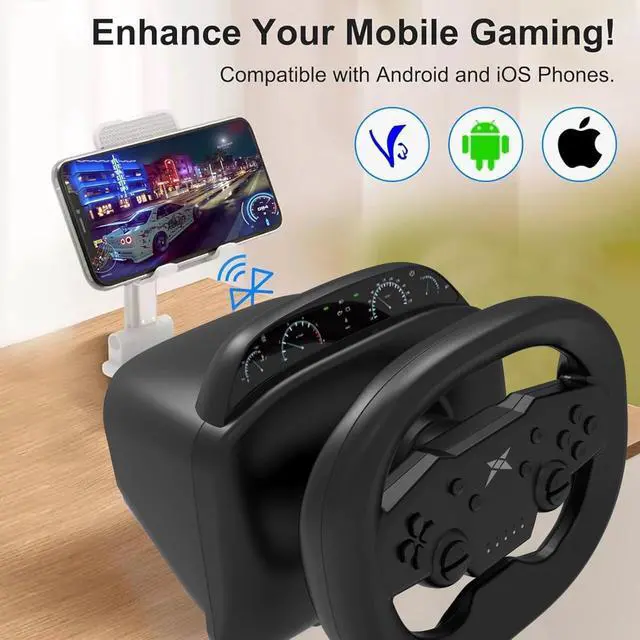 This gaming steering wheel is compatible with Android, iOS, PS3/PS4, Nintendo Switch, and PC. It features Bluetooth 5.0, wired/wireless connections, motor vibration, and cat ear LED lights. With dual-vibration motors and advanced settings, it offers precise control.