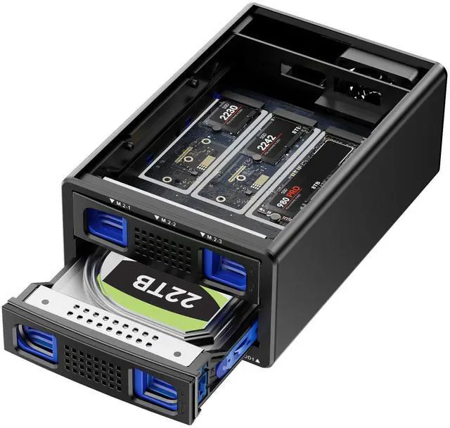 Innovative hybrid storageCENMATE's First Hybrid HDD+NVMe SSD Enclosure.The Hard Drive Enclosure can hold 1 SATA HDDs/SSDs and 3 M.2 2230/42/60/80/110 NVMe SSDs.Maximum capacity of 22TB per drive and 8TB per M.2 SSD.Expanding the capacity for users by a maximum of 46TB (Max 22TB HDD+3*8TB), combining the advantages of HDDs massive capacity and SSDs high-speed performance simultaneously!