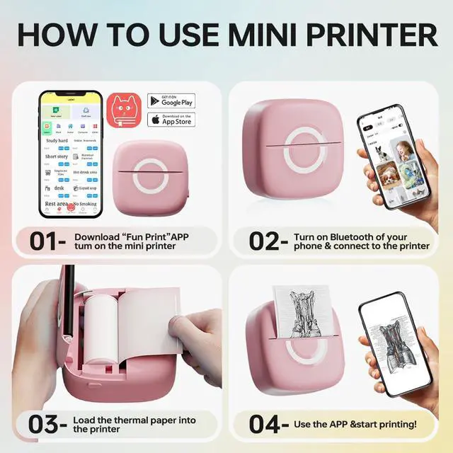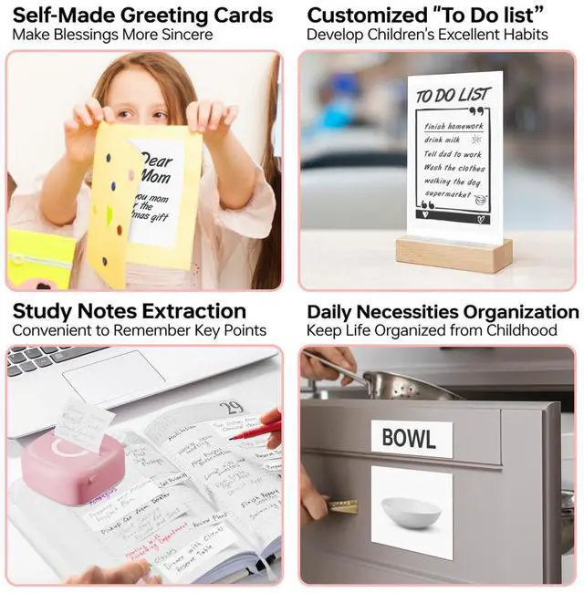 [Enjoy More Interesting Life] New style inkless pocket printer is used to print pictures/photos,memo,shopping lists,study/meeting notes and etc.Mini sticker printer machine,it's a great helper to decorate your bullet journal more memorable,to make photos more stylish,to organize study notes more efficiently,to keep track of happiness moments at anytime etc.Undoubtedly,it must be a special gift for children,students,teachers and DIY craftsman on Christmas,Children's Day and Thanksgiving day.