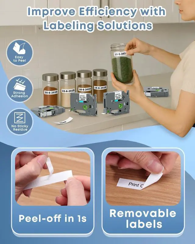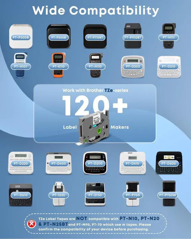 Work with Brother Ptouch label makers that Use TZe label tapes: PT-D210, PT-D220, PT-D202, PT-D200, PT-H110, PT-D410, PT-D400, PT-D400AD, PT-D410BT, PT-D600, PT-D610BT, PT-P710BT, PT-P700, PT-1890W, PT-P910BT, PT-H100, PT-D400VP, PT-D450, PT-D600VP, PT-P750W, PT-1230PC, PT-1280, PT-1290, PT-1880, PT-P300BT and more