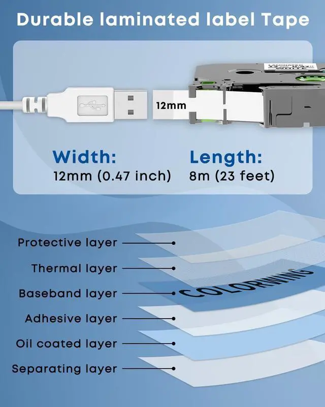 Laminated Standard TZ Tape: TZ Tape 12mm 0.47 laminated white replace for brother label tape with the features of withstands smudge and scratch, withstands temperature from -22° (-30°C) To 258° (120°C) , water and UV, and strong adhesion. These TZ231label tapes are perfect for indoor and outdoor use