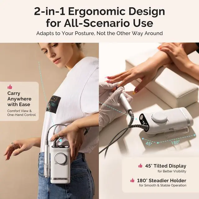 From MelodySusie Rechargeable Clip-On Nail Drill Collection: The SM320G Rechargeable 35,000 RPM 2-in-1 Nail Drill features a clip-on design for easy waist attachment, a tilted LED display, and a parallel holder. This allows convenient mobile nail services, better display visibility, and steadier control when adjusting speed or pressing buttons. The pen-shaped handpiece is lightweight and ergonomic, reducing hand fatigue. Available in pink and white.
