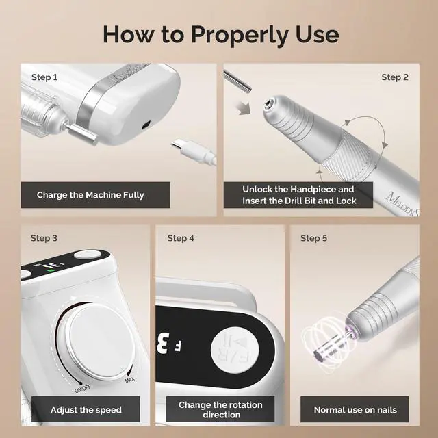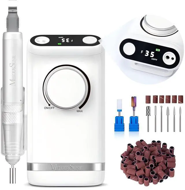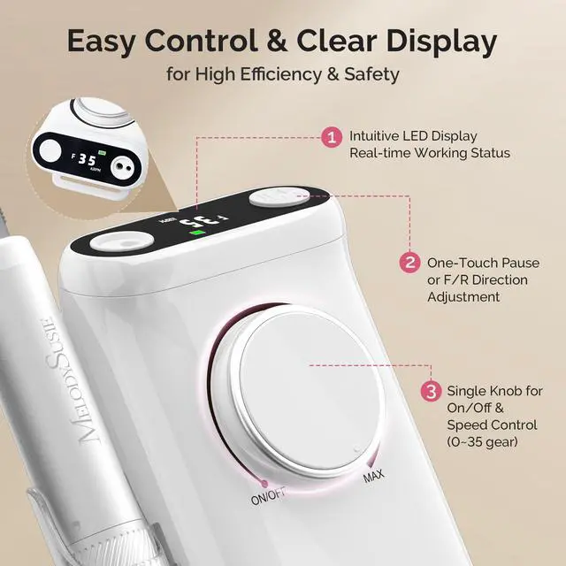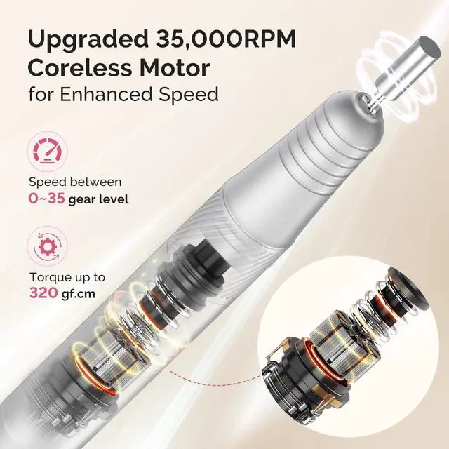Rapid & Efficient Filing for All Manicure Needs: This upgraded electric nail file features advanced stepless speed control and a coreless metal motor reaching up to 35,000 RPM with 320 gf.cm torque, producing low noise, vibration, and heat. The durable motor ensures high filing efficiency and minimal wear, while adjustable speeds provide precise control for trimming, shaping, polishing, and removing acrylic or gel nails with ease.