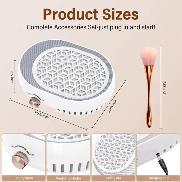 Plug-in Stable Power & Continuous Operation Unlike cordless models, this nail dust collector connects directly to AC100-240V for consistent, uninterrupted performance. No battery worries, ideal for long salon sessions and home manicure use.