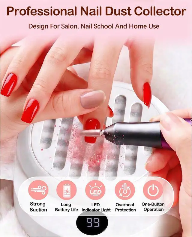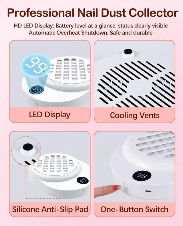 LED DISPLAY & SIMPLE CONTROL Unsure about battery levels during use? The HD LED display shows real-time power status clearly, while the one-button operation makes it easy for beginners and professionals. Combined with a brushless motor, this nail vacuum dust collector delivers strong performance with low noise. A smart upgrade compared to basic nail dust collector devices.