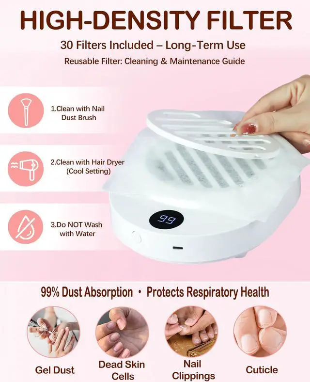 30 FILTERS INCLUDED & EASY MAINTENANCE Worried about ongoing costs? Comes with 30 replacement filters to support long-term use and reduce frequent purchases. The detachable design allows quick cleaning and maintenance, making it a practical nail dust collector filter solution and efficient dust collector for nails.