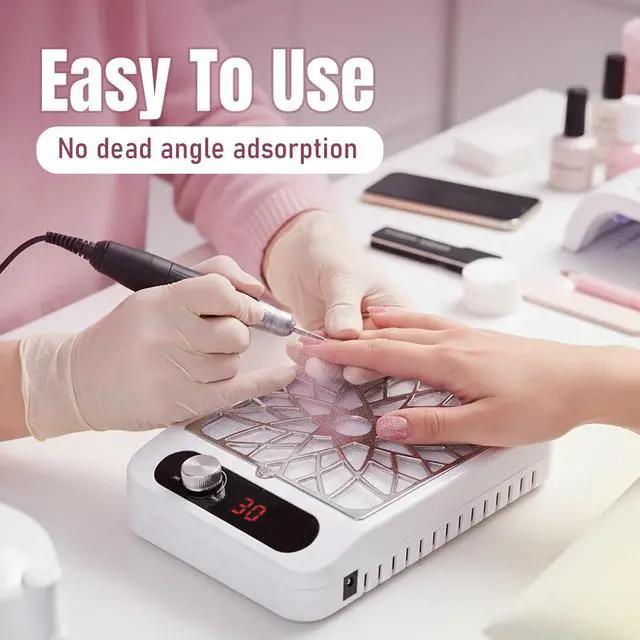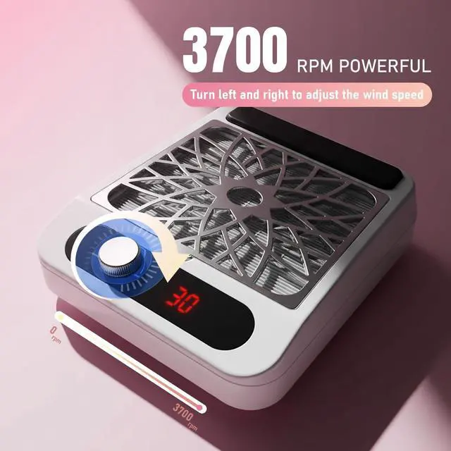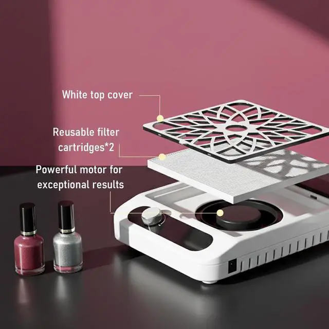Powerful, Adjustable Suction High-efficiency fan with 3 speed levels captures fine nail dust from gel, acrylic, polygel and natural nail filing; dial the suction to match manicures, pedicures or quick touch-ups.
