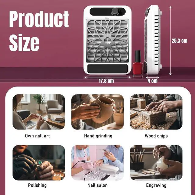 Compact & Portable Design Slim body with one-knob control and LED display; light enough to move station-to-station and sized to fit most manicure tabletops without clutter.
