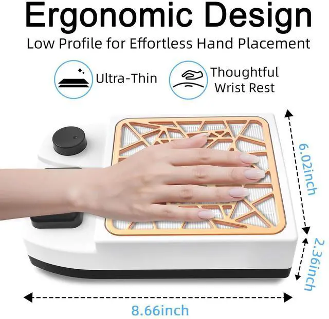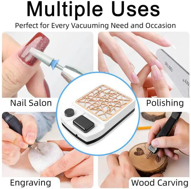 The nail vacuum fan is equipped with a 9-blade brushless motor at 4000 RPM, this nail dust collector for nail techs can efficiently captures dust and debris from all directions, and absorbs up to 95% nail dust. Giving you and your customer a breathing environment while filing or polishing nails, perfect for false nails, gel nails, hard gel nails, and everyday nail care with low noise performance