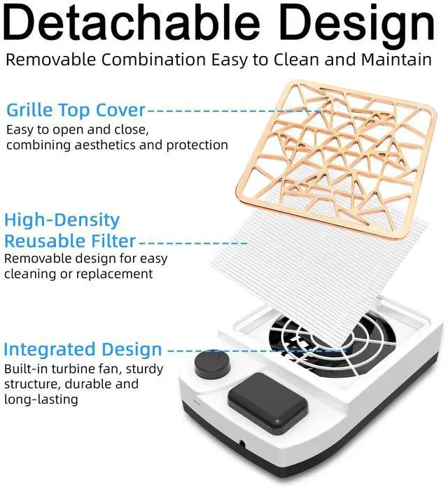 & This nail dust collector vacuum fan comes with a reusable fine dust filter, and features a detachable design. Simply remove the top pannel and remove the filter and clean with a brush or a quick blast from a hairdryerno need for constant replacements. For optimal performance, we recommend replacing the filter every 3-4 months, no more costly disposable filter replacements